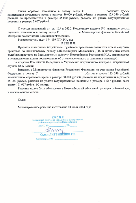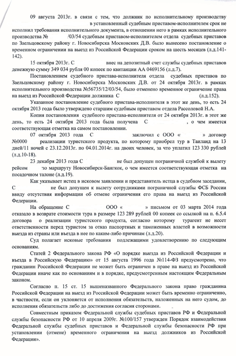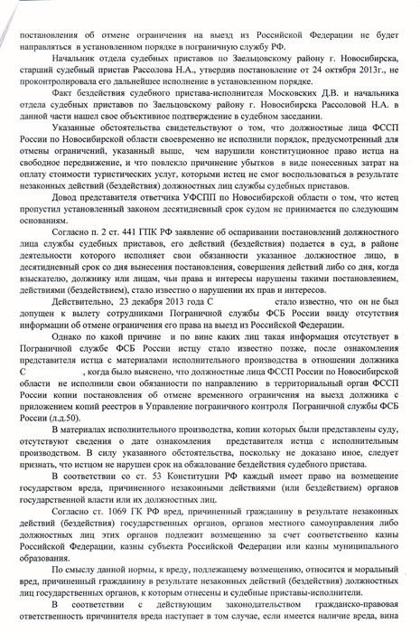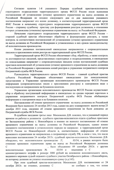 Однако, в дату планируемой поездки, гр. С. не был допущен пограничной службой к вылету, в связи с отсутствием сведений об отмене временного ограничения на выезд, которые должностные лица службы судебных приставов в установленном порядке должны были передать в пограничную службу ФСБ России.